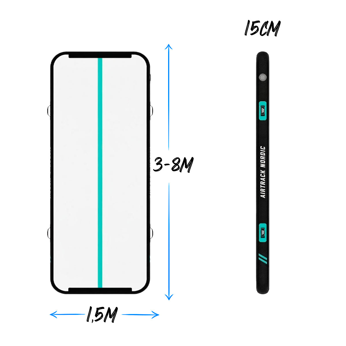 AirTrack Nordic Black är en specialdesignerad 15 cm tjock 1,5 meter bred AirTrack madrass som du kan välja mellan 3-6 meter. Svarta kolfiberliknande kanter och gula eller mint detaljer gör denna AirTrack snygg. I båda ändar har madrassen kardborrefäste med full bredd.
